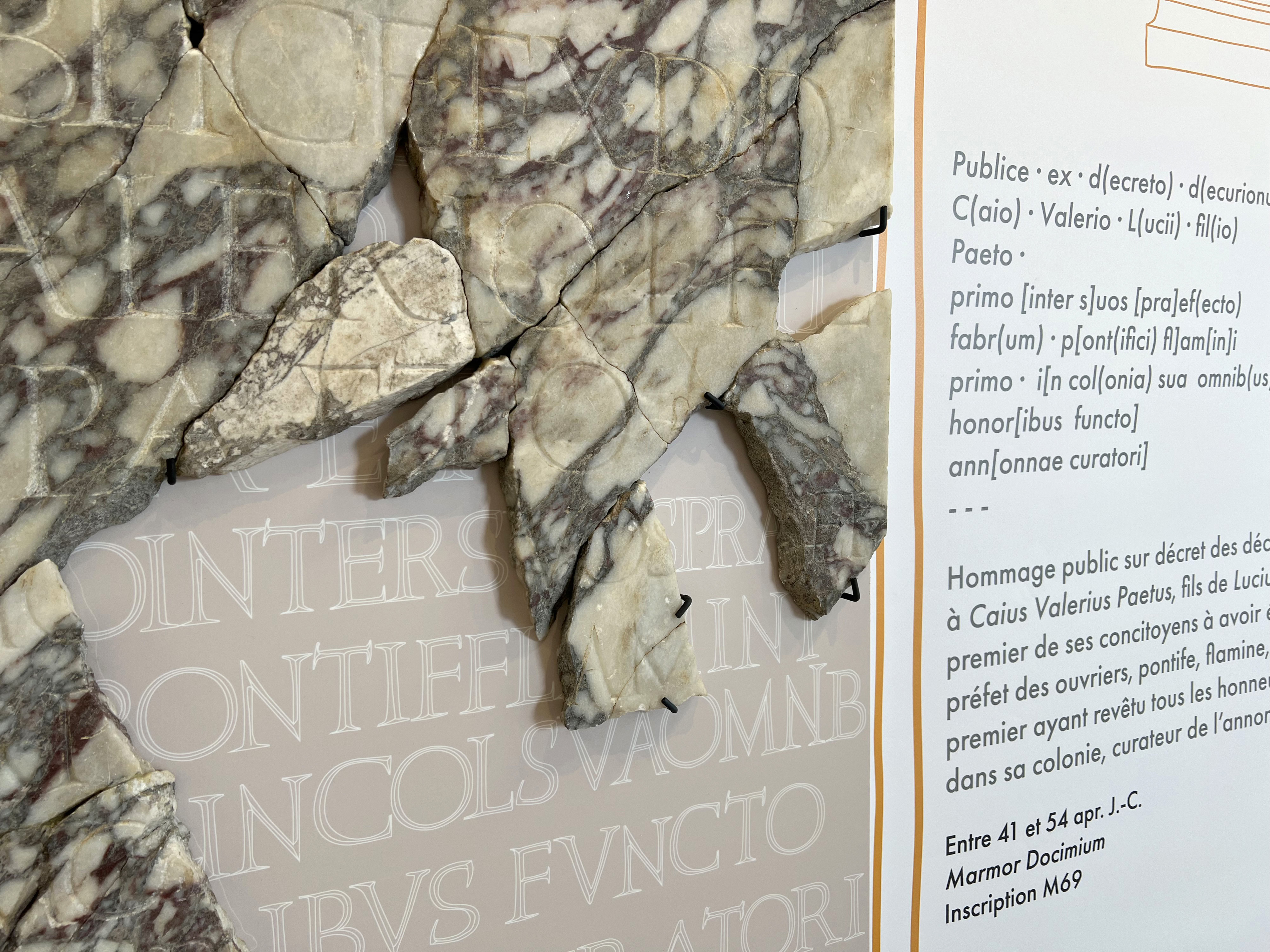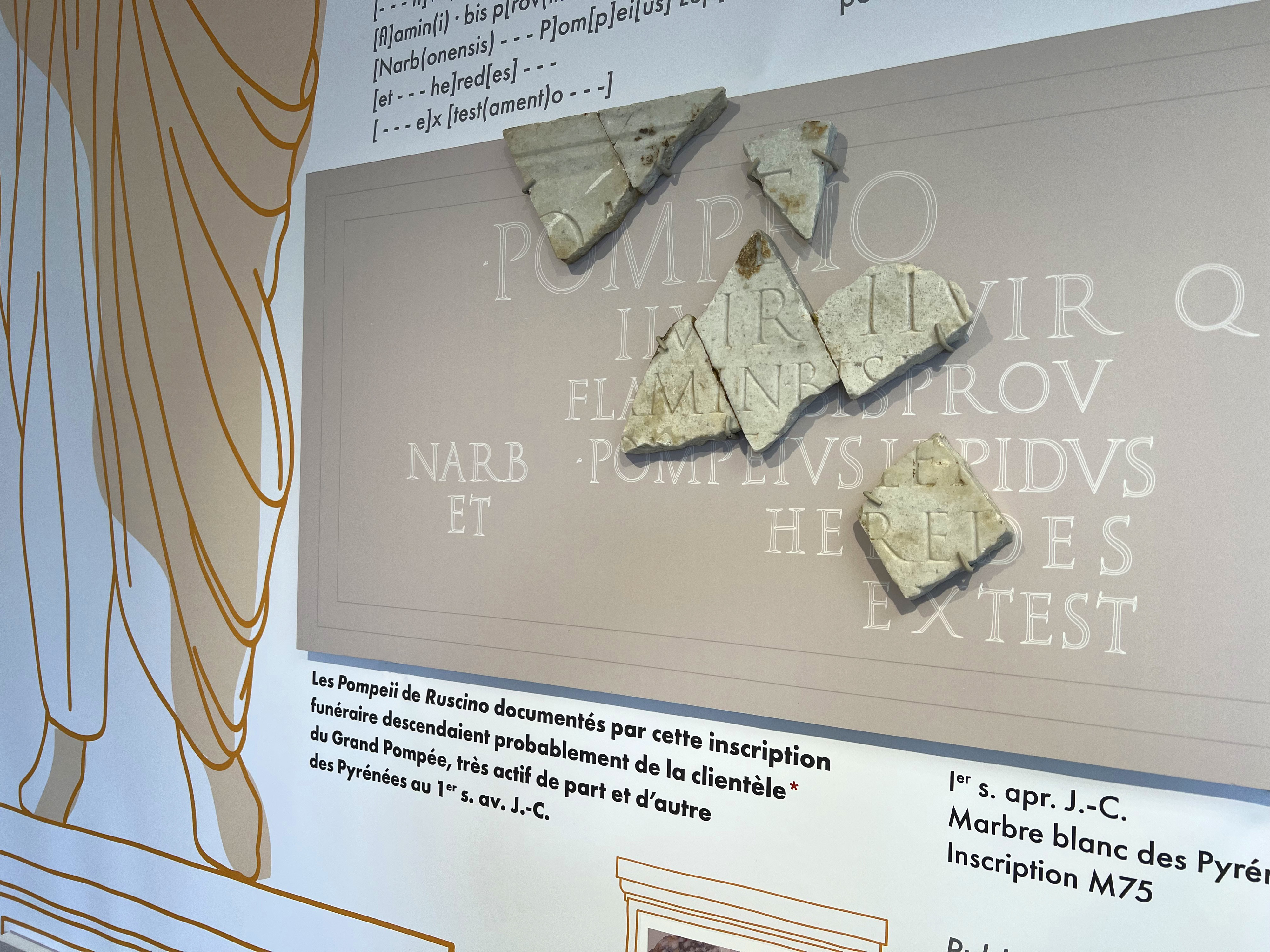 Une exposition qui met en scène les inscriptions romaines issues des fouilles archéologiques témoignant de la statuaire monumentale du forum de Ruscino (une inscription = une statue).