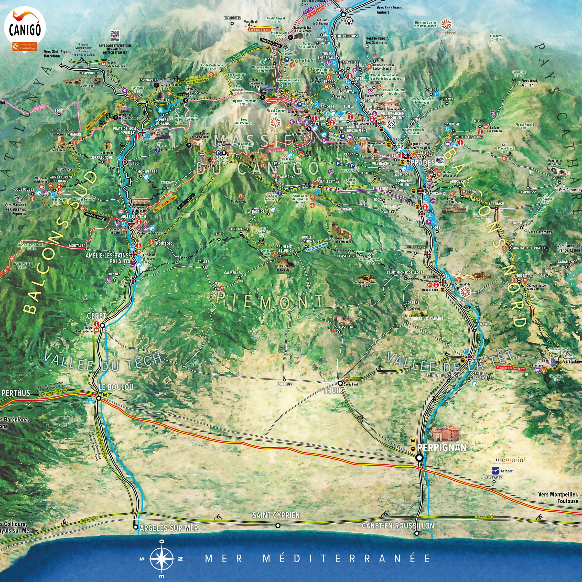 Création d’un visuel permettant la représentation de la volumétrie du massif, des vallées de la Têt et du Tech, et des balcons avec réseau en perspective aérienne.