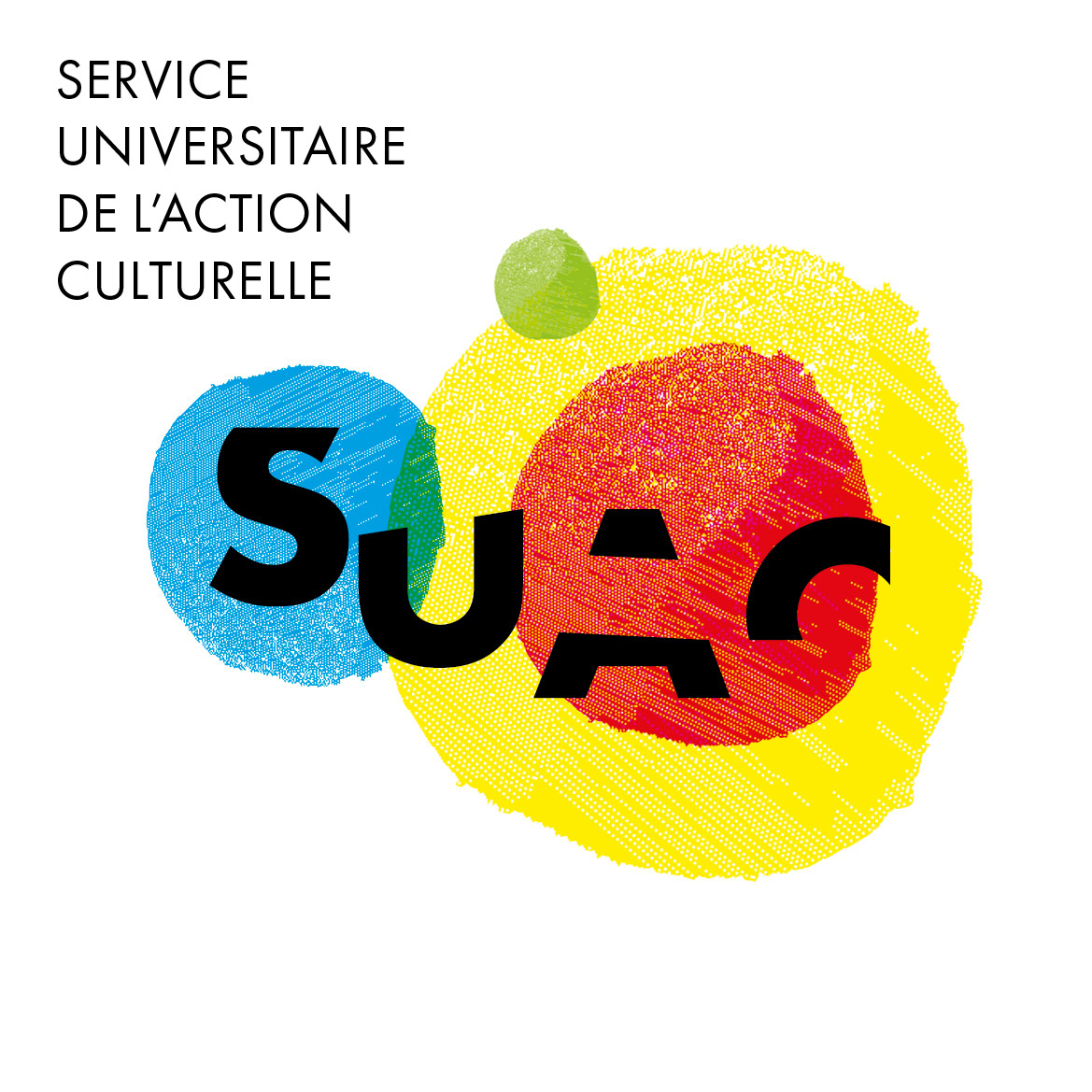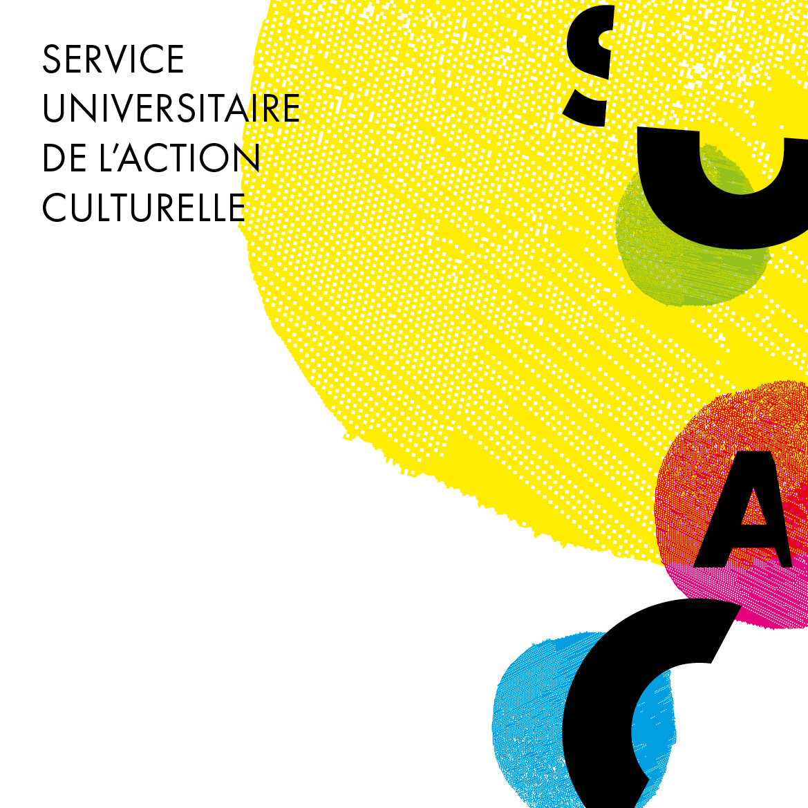 Pour le Service Universitaire de l’Action Culturelle (SUAC) de l’Université de Haute‑Alsace, une identité visuelle modulable a été créée autour d’un système de formes colorées et des lettres “S‑U‑A‑C”.