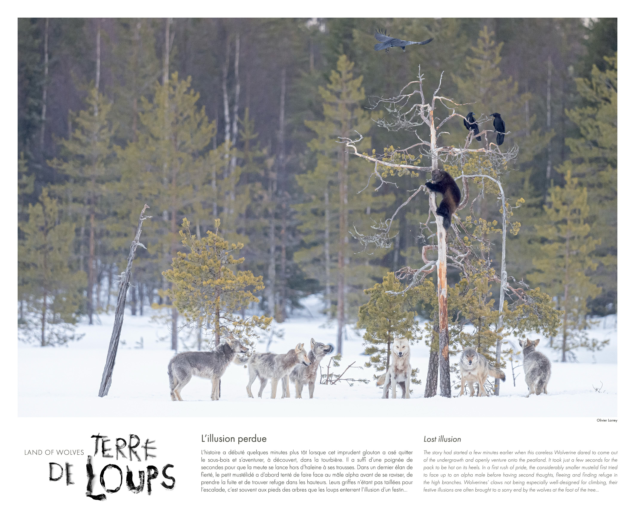 Olivier Larrey a choisi de se confiner dans un minuscule affût de bois et d’attendre sans en sortir pendant des semaines que les animaux viennent à lui (frontière entre la Finlande et la Russie, au cœur d’une tourbière, à la lisière d’une forêt boréale).