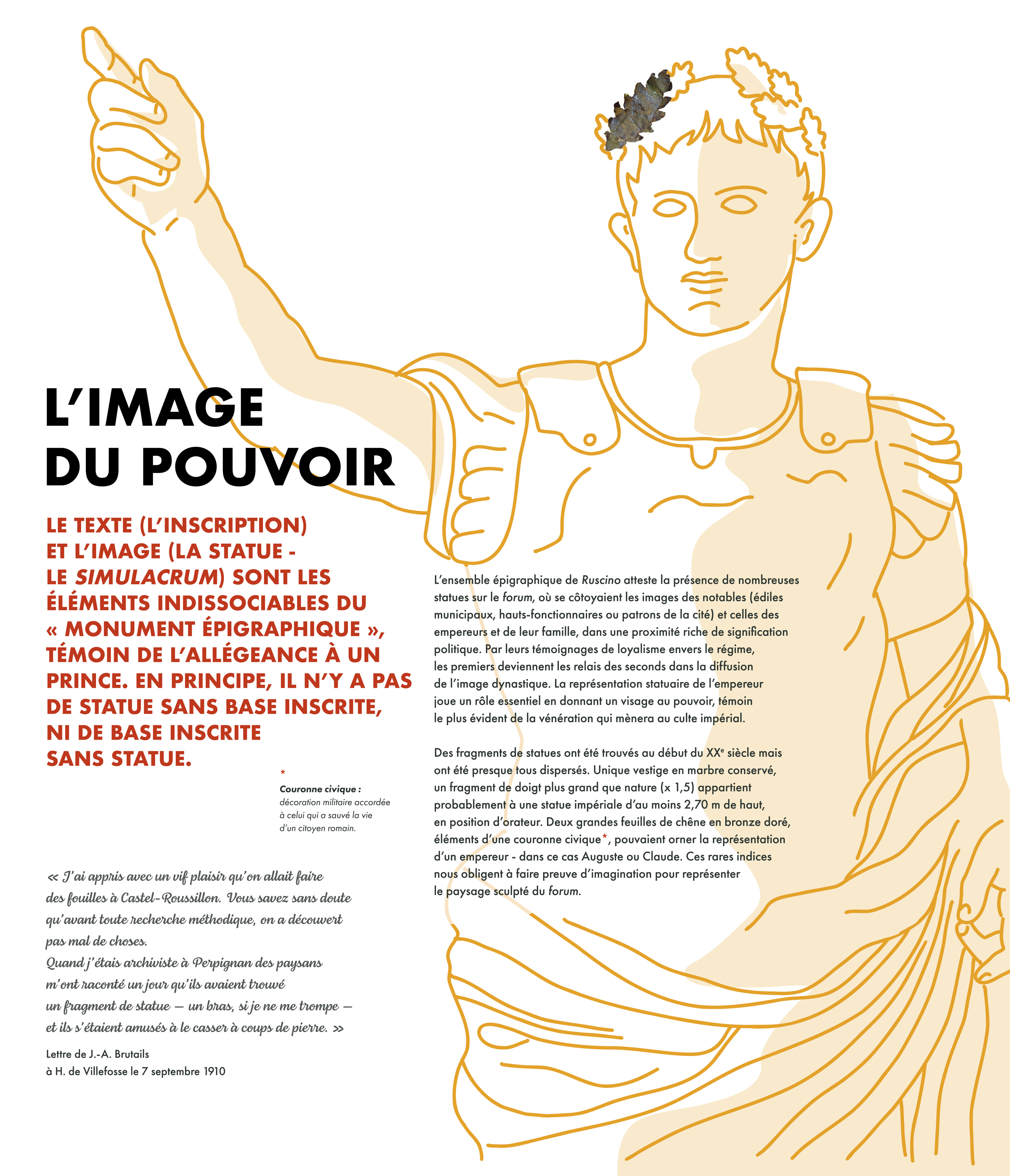 Une exposition qui met en scène les inscriptions romaines issues des fouilles archéologiques témoignant de la statuaire monumentale du forum de Ruscino (une inscription = une statue).