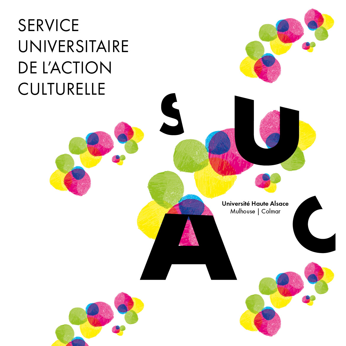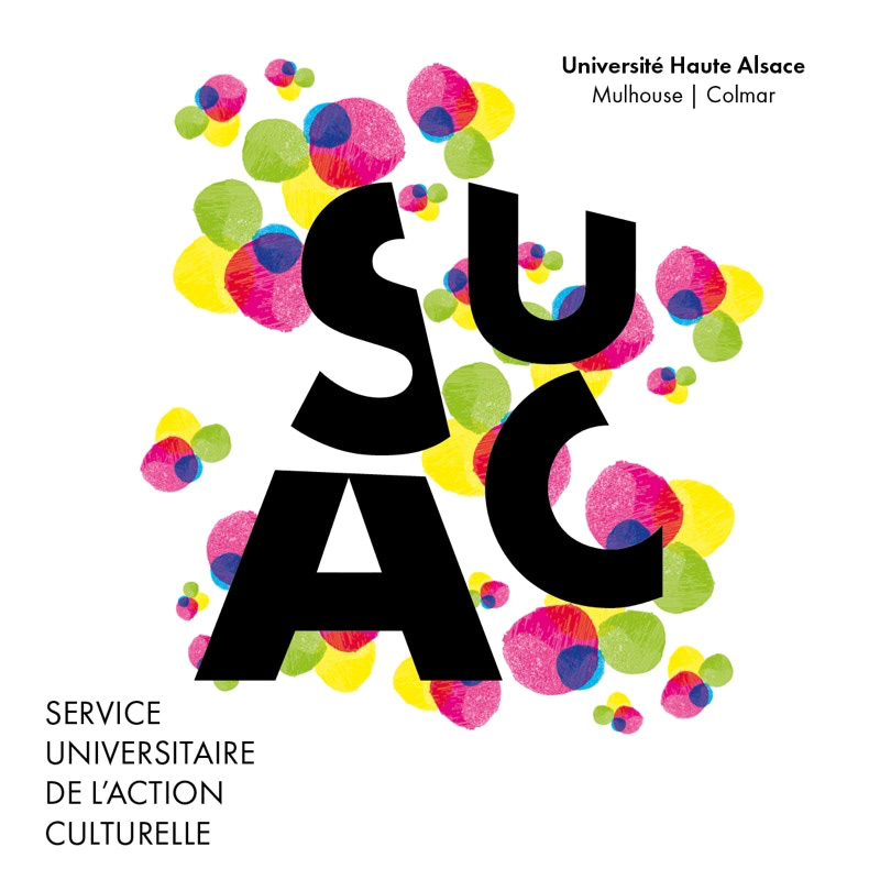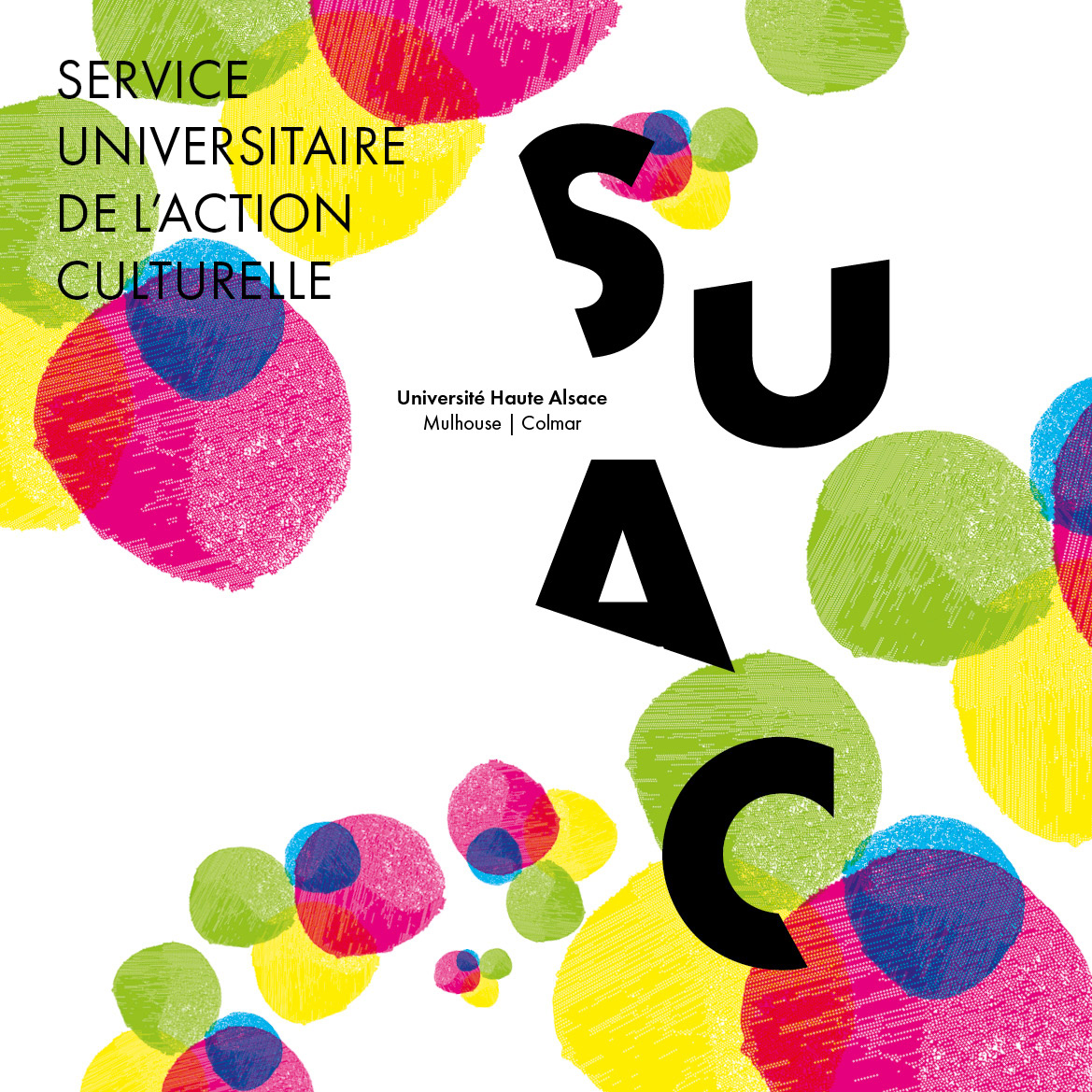Pour le Service Universitaire de l’Action Culturelle (SUAC) de l’Université de Haute‑Alsace, une identité visuelle modulable a été créée autour d’un système de formes colorées et des lettres “S‑U‑A‑C”.