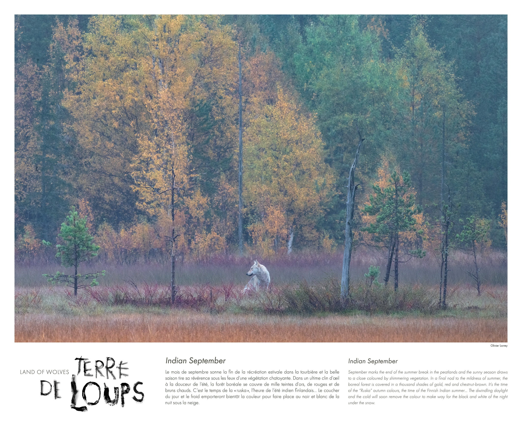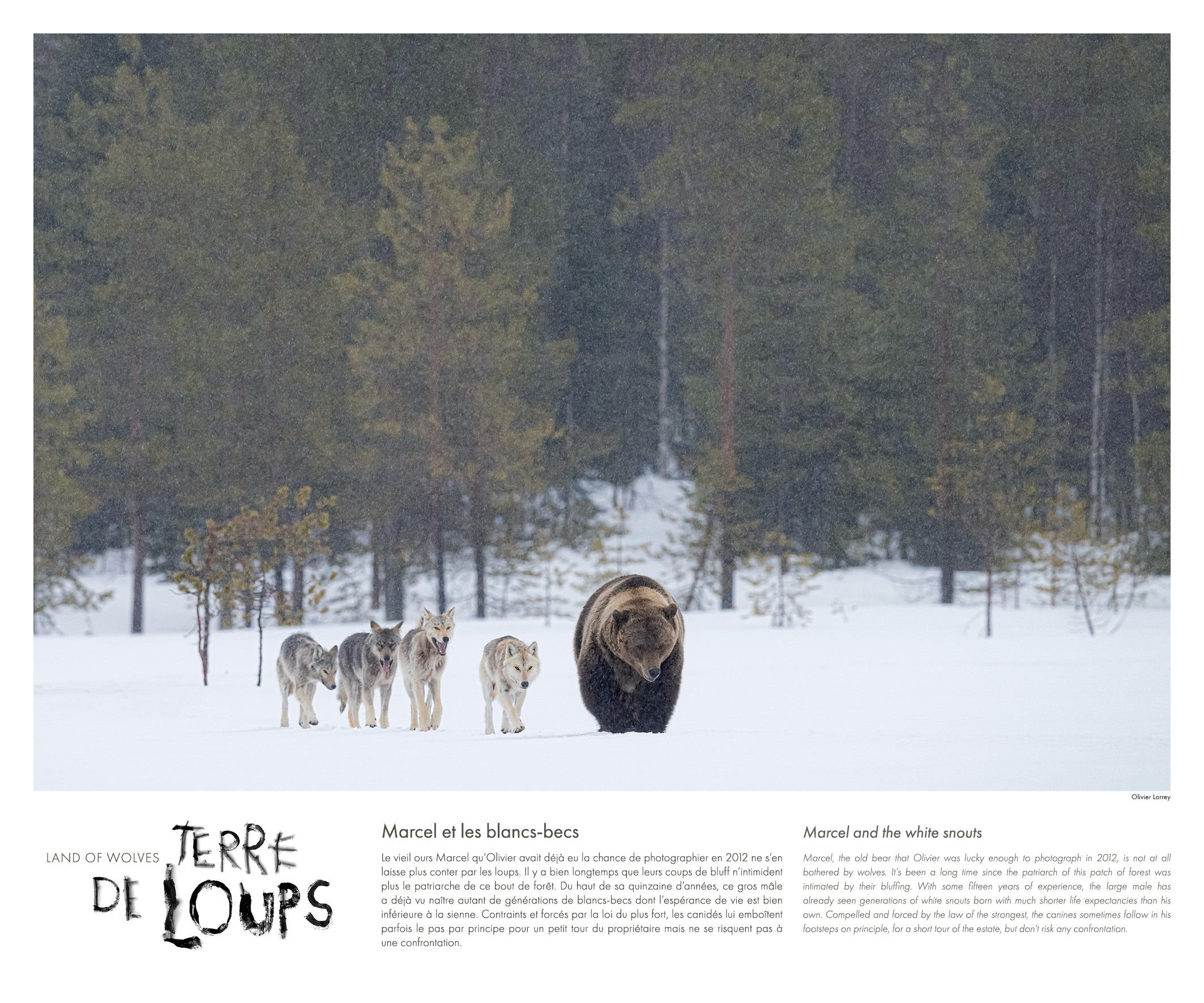 Olivier Larrey a choisi de se confiner dans un minuscule affût de bois et d’attendre sans en sortir pendant des semaines que les animaux viennent à lui (frontière entre la Finlande et la Russie, au cœur d’une tourbière, à la lisière d’une forêt boréale).